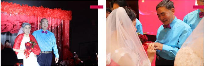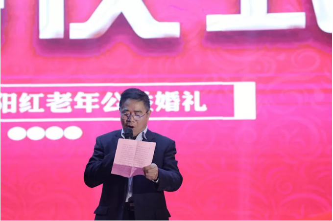 18時,“夕陽紅”婚宴正式開始。晚宴由錢建軍、王霞主持。宴會開始后鹽城市委宣傳部副部長,市文明辦主任周柏青致辭,鹽城市老齡協(xié)會常務(wù)理事、攝影分會副主席張友余為參加活動18對伉麗夫婦證婚。這一天,18對老人穿著婚紗禮服齊聚千鶴灣國際宴會中心,在400名親友的見證下,在眾多愛心人士及志愿者的幫助下,交換婚戒,成為夫妻。彌補了這幾十年來的遺憾,給彼此的青春歲月畫上了一個圓滿的句號。現(xiàn)場還為老人們準備了很多精彩的節(jié)目,讓老人們看的開心,吃的熱鬧。