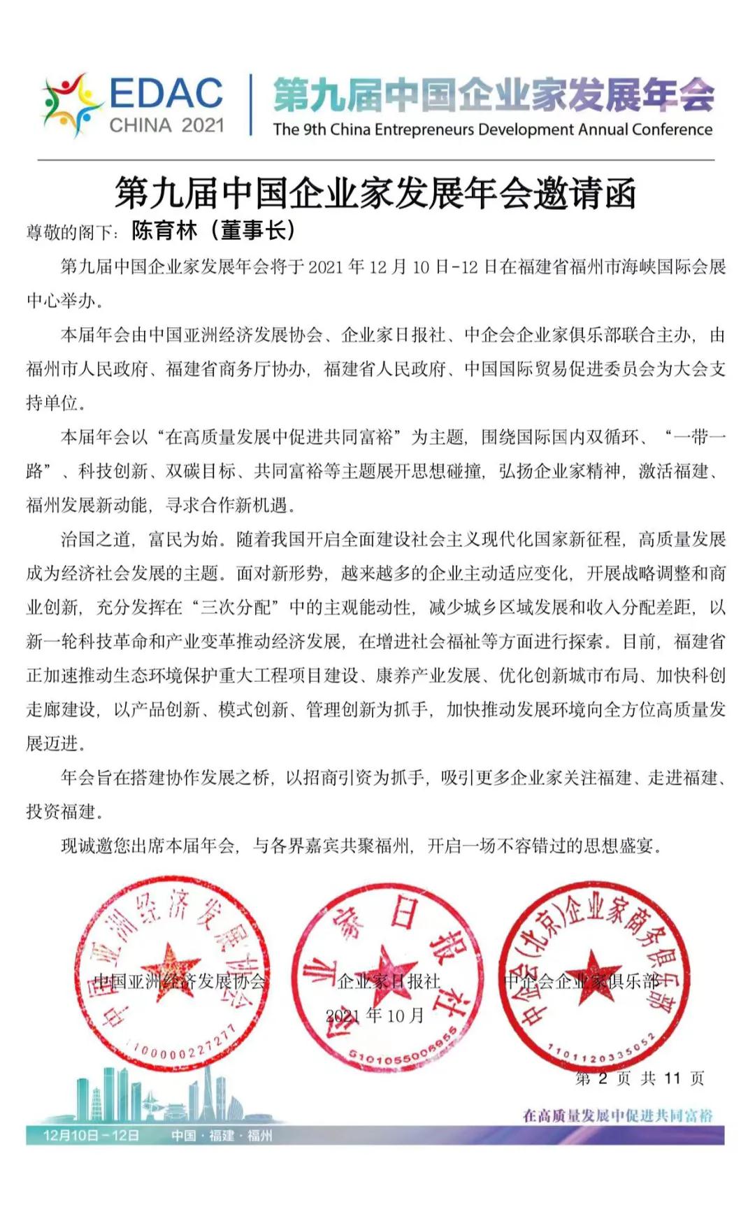 遠航家居集團董事長陳育林先生收到了來自第九屆中國企業家發展年會組委會發來的邀請函。